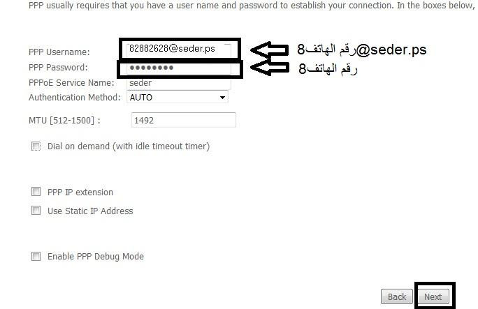 8- يتم هنا وضع اسم المستخدم وكلمة المرور الخاصة بخط هاتفك.