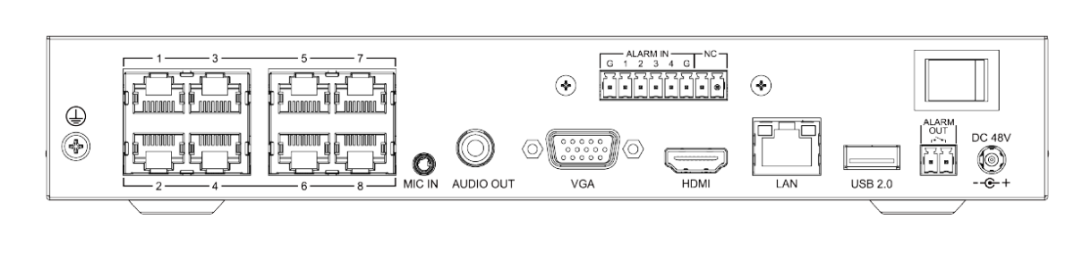 ·8MP(30fps)×2, 6MP(30fps)×2, 5MP(30fps)×3,4MP(30fps)×4, 3MP(30fps)×5, 1080P(30fps)×8 playback decoding capacity